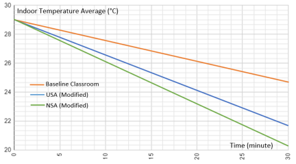 classroom (refer to fig. 2), the air temperature distribution is relatively lower compared to the baseline and shows uniformity. The trend shows a decrease in the overall internal temperature as the temperature gradually becomes even. The air distribution for the USA Modified Classroom (refer to fig. 3) showed that around the right side is lower than that around the left side. Comparing this result to the NSA modified Page 3 of 30 classroom, the air temperature distribution in the upper zone is visibly different. It indicated that converging furniture on the sides of the classroom increases the indoor temperature and affects the distribution negatively due to the higher traffic if applied to real world scenarios.