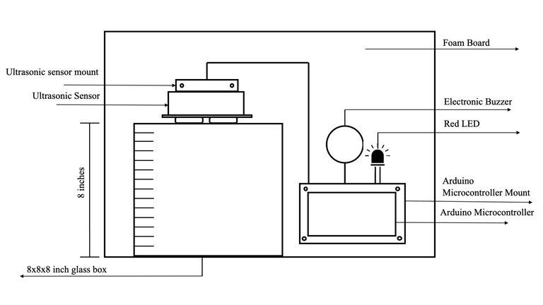 A setup to simulate increasing levels of flood water was constructed as shown in Figure 1. The robotic components of the ARS are attached using the foam board. The ultrasonic sensor mount was attached 8 inches high or directly above the edge of the 8x8x8 glass box and the ultrasonic sensor rested on top of it. A laptop was used as a power source for the robot and ran the conditional code to measure the flood height and enable the presence of auditory and visual cues. A volume of water was dispensed from a height, simulating the yellow, orange, and red flood heights of 2.29, 5.63, and 6.58 inches respectively. The data of the ARS was collected through the Arduino serial monitor and the manual staff gauge was collected through the readings of the assigned researcher. Five trials were performed for each flood level warning and the water was manually drained out after each trial.