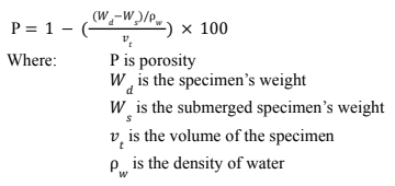 The instruments for this study are the compressive strength and porosity tests. Compressive strength can determine the maximum stress, while porosity tests determine the amount of water the pervious concrete can hold (Vu et al., 2020; Muda et al., 2023). Following Akkaya and Cagatay (2021), the formula of the porosity is: